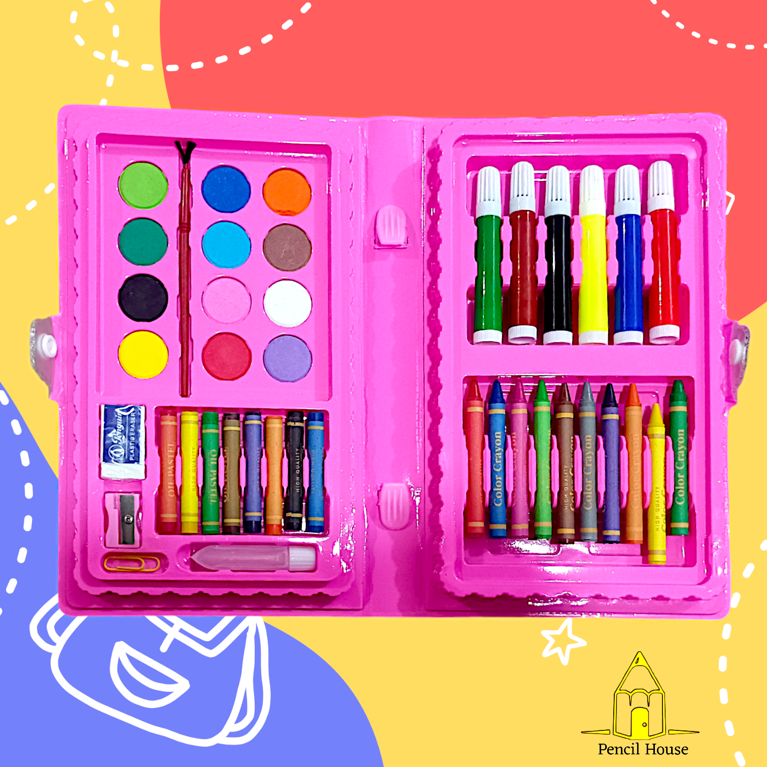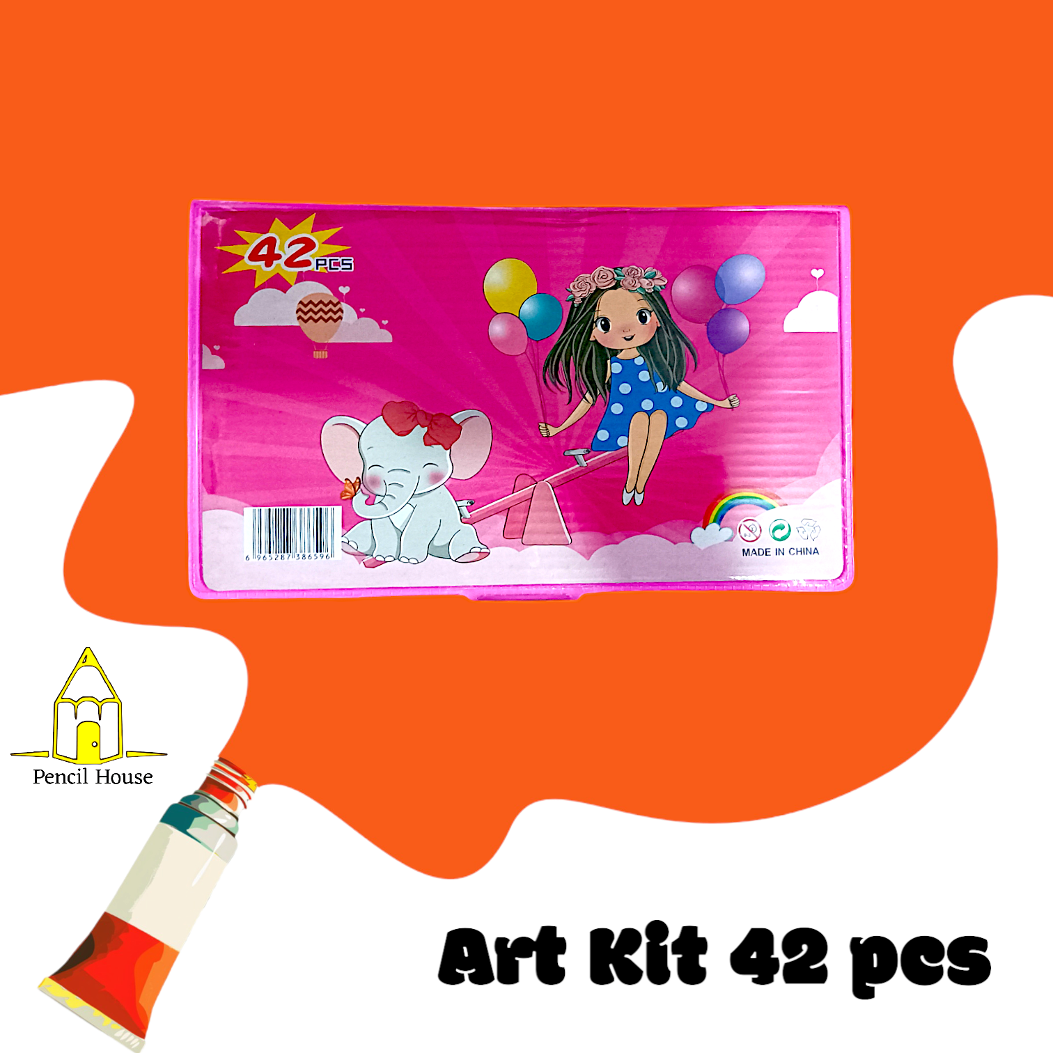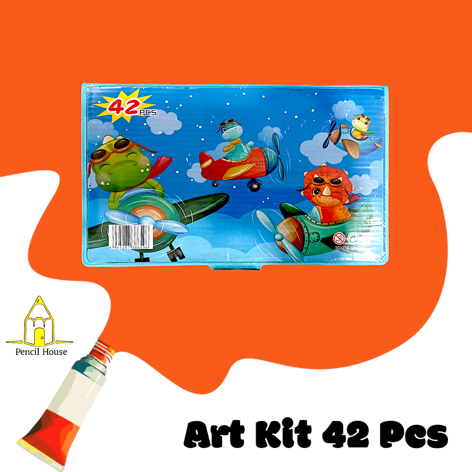 The 42 Pcs Art Kit typically includes a variety of supplies such as 10 watercolour paints, 10 crayons, 8 oil pastels, 6 washable felt-tip markers, a paintbrush, an eraser, and a sharpener. It is designed for drawing and painting, making it suitable for artists of all ages.